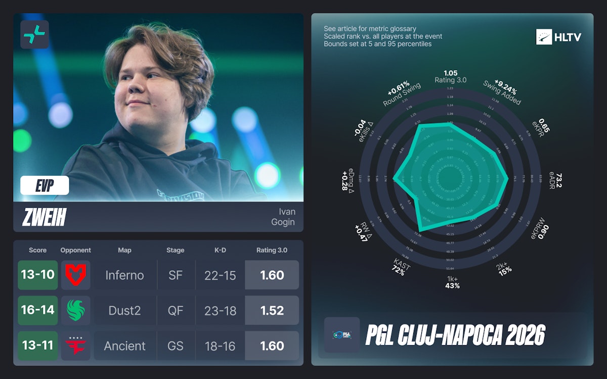 因此,尽管zweih的赛事总Rating仅为1.05,且全队表现均可圈可点,但凭借在系列赛获胜地图中场均1.21的Rating和100.0的获胜回合均伤,以及在四场关键的竞技场胜利中场均1.33的出色发挥,他依然足以获得EVP的提名。
