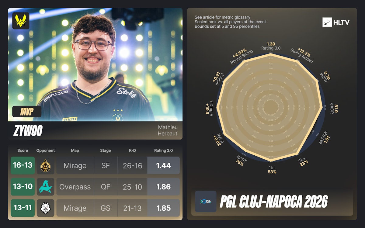 本次赛事也是ZywOo个人第30次荣膺MVP,随着时间推移和其奖杯陈列柜不断充实,越来越多评论员将他加冕为CS历史上最伟大的选手。克卢日站再次见证了法国人的统治力——1.39的赛事Rating位列其职业生涯大型赛事评分第16位,这一数据足以彰显他的卓越。