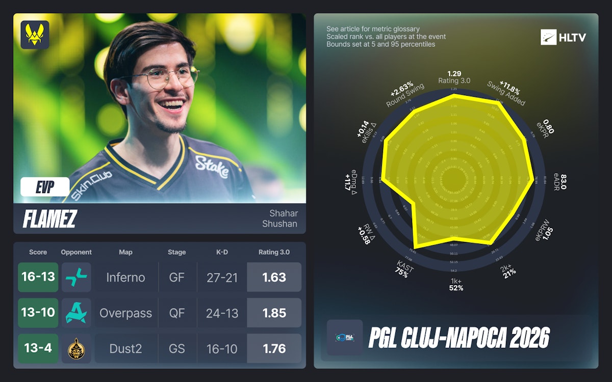 flameZ在罗马尼亚打出了职业生涯最佳赛事,季后赛平均Rating高达1.41,总Rating1.29,每回合获胜击杀数达到1.02。他在总决赛中同样荣膺比赛最佳选手,在3-0的胜利中砍下1.48的Rating。