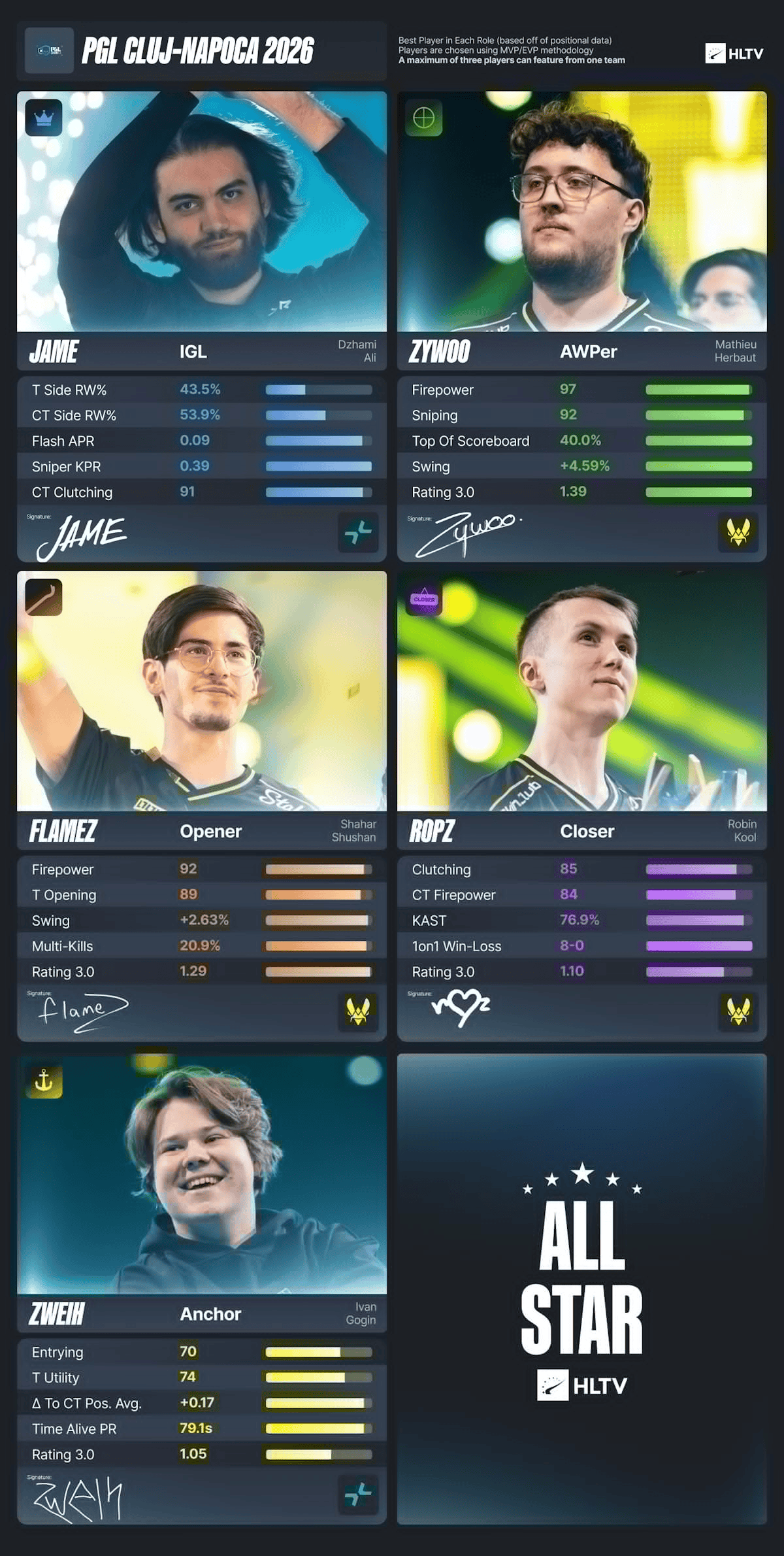 ZywOo与flameZ领衔全明星阵容,但他们的统治力意味着五人大名单中仅能为另一位Vitality球员腾出一个名额。