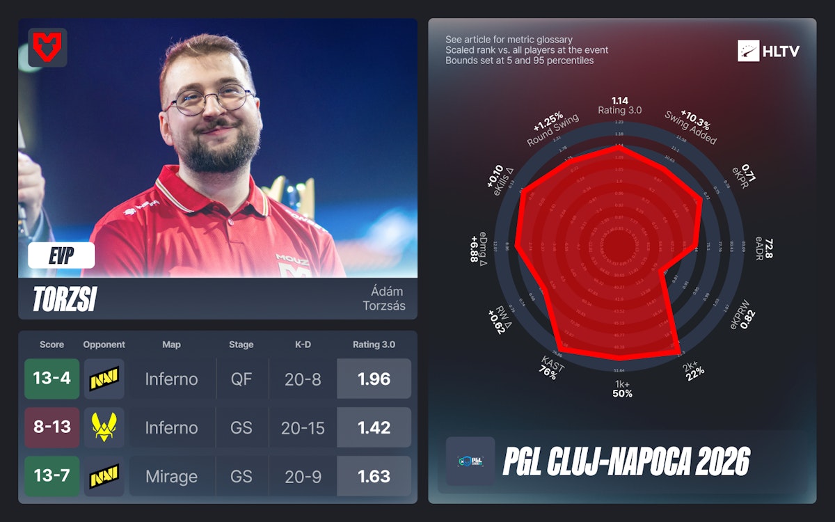 他在小组赛阶段表现稳健,甚至在与Vitality的交锋中顽强抵抗——这比本榜单上的大多数选手都要出色,更不用说赛事中的其他选手了——并在对阵Natus Vincere的决胜局中,凭借炼狱小镇上1.96的Rating和上半场125的均伤,锁定EVP席位。