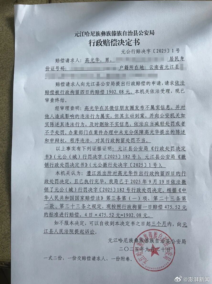 另据潇湘晨报,9月19日,记者从当事人处了解到,高光华不服该处罚决定,已向元江县人民政府申请行政复议,请求确认被申请人元江县公安局所作的《行政处罚决定书》违法,并申请被申请人支付国家赔偿金1902.08元,精神损害抚慰金1元。天创优配提示:文章来自网络,不代表本站观点。